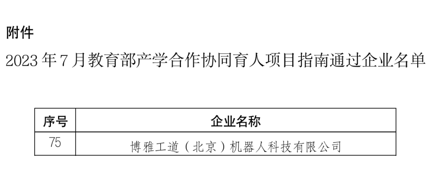 教育部公布了2023年7月產(chǎn)學(xué)合作協(xié)同育人項(xiàng)目申報(bào)指南通過(guò)企業(yè)名單,博雅工道(北京)機(jī)器人科技有限公司積極響應(yīng)號(hào)召并成功入選。