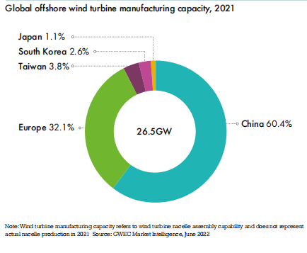 我國風電產業(yè)雖起步晚,但是增長快。前幾年我國實行的補貼政策推動了風電行業(yè)的“搶裝潮”,著實推動了相關行業(yè)的發(fā)展。從 GWEC(全球風能理事會)2022 年發(fā)布的海上風電行業(yè)報告來看,來自中國的企業(yè)已成為全球最大的海上風電風機基礎的制造商,把常年位居榜首的龍頭企業(yè)西門子歌美颯擠出了前三,而我國生產的風機還未在境外完成過安裝,這就表明巨大的產量全部都投入到了國內市場。
