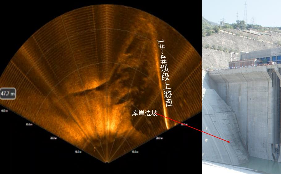 根據《水電站大壩安全定期檢查監督管理辦法》規定,大壩定檢一般每五年進行一次。首次定檢后,定檢間隔可以根據大壩安全風險情況動態調整,但不得少于三年或者超過十年。桐子林水電站 2016 年 3 月工程竣工,于 2021 年迎來了首次定期檢查。同年 5 月,受國家水電站大壩安全和應急工程技術中心委托,我公司攜帶纜控無人潛航器 R1-45 搭載水下高清攝像和圖像聲吶對水電站大壩上游面和門槽水下進行檢查。