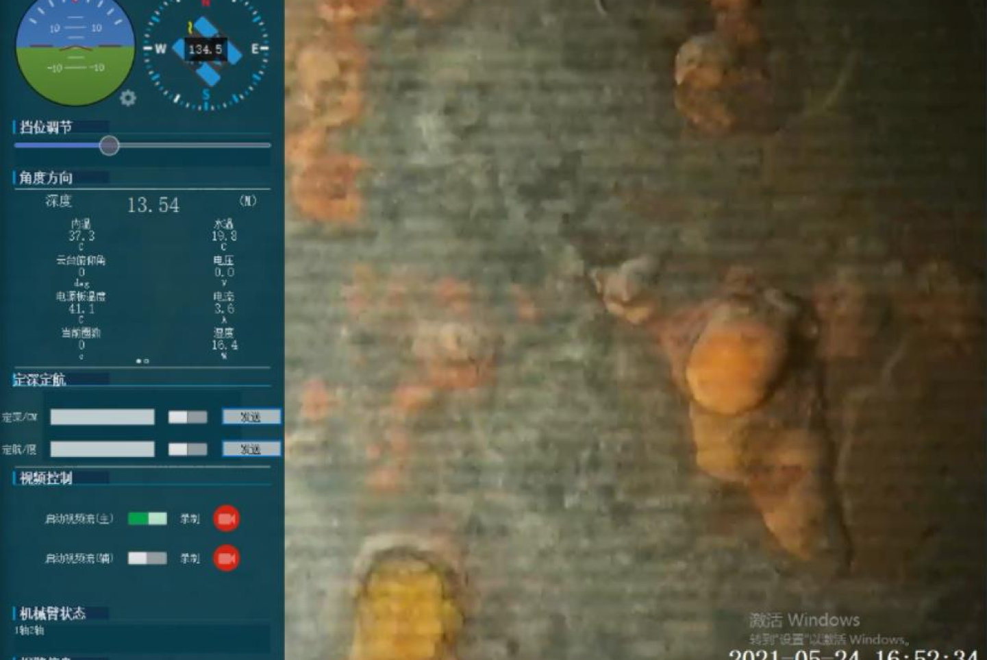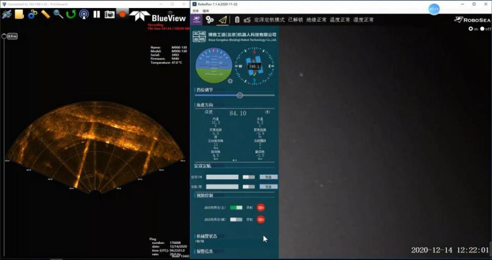 此次任務搭載的多波束圖像聲吶發射的聲波遇到目標后反射回聲納表面,根據回波可以獲得多波束目標聲吶圖像信號,這樣 ROV 系統就能在渾濁或黑暗環境下實現對目標物體的辨識和定位。有了聲吶的幫助,在水下,可以輕易地判斷出設備所處位置,對操作帶來了極大便利,下圖為攝像頭中未出現參照物時操作調整 ROV 的情況。