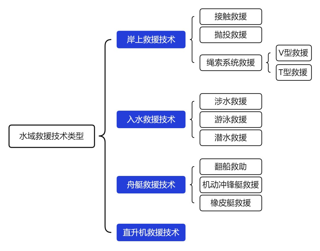 《水域救援作業指南》作為我國首部指導水域事故處置的行業標準,給救援隊伍的建設提供了有力的參考,對現場管理、人員裝備和行動方案都提出了要求?!吨改稀分羞€明確了水域救援適用的 5 項災害事故類別,包括:內河湖泊船舶擱淺翻沉事故;車輛、列車、飛行器等交通工具墜水事故;洪澇災害;落水遇險事件以及孤島遇險事件。相應的,針對不同災害事故類型,通過分析借鑒了國外專業救援認證機構的經驗,列出了 10 類水域救援技術類型。