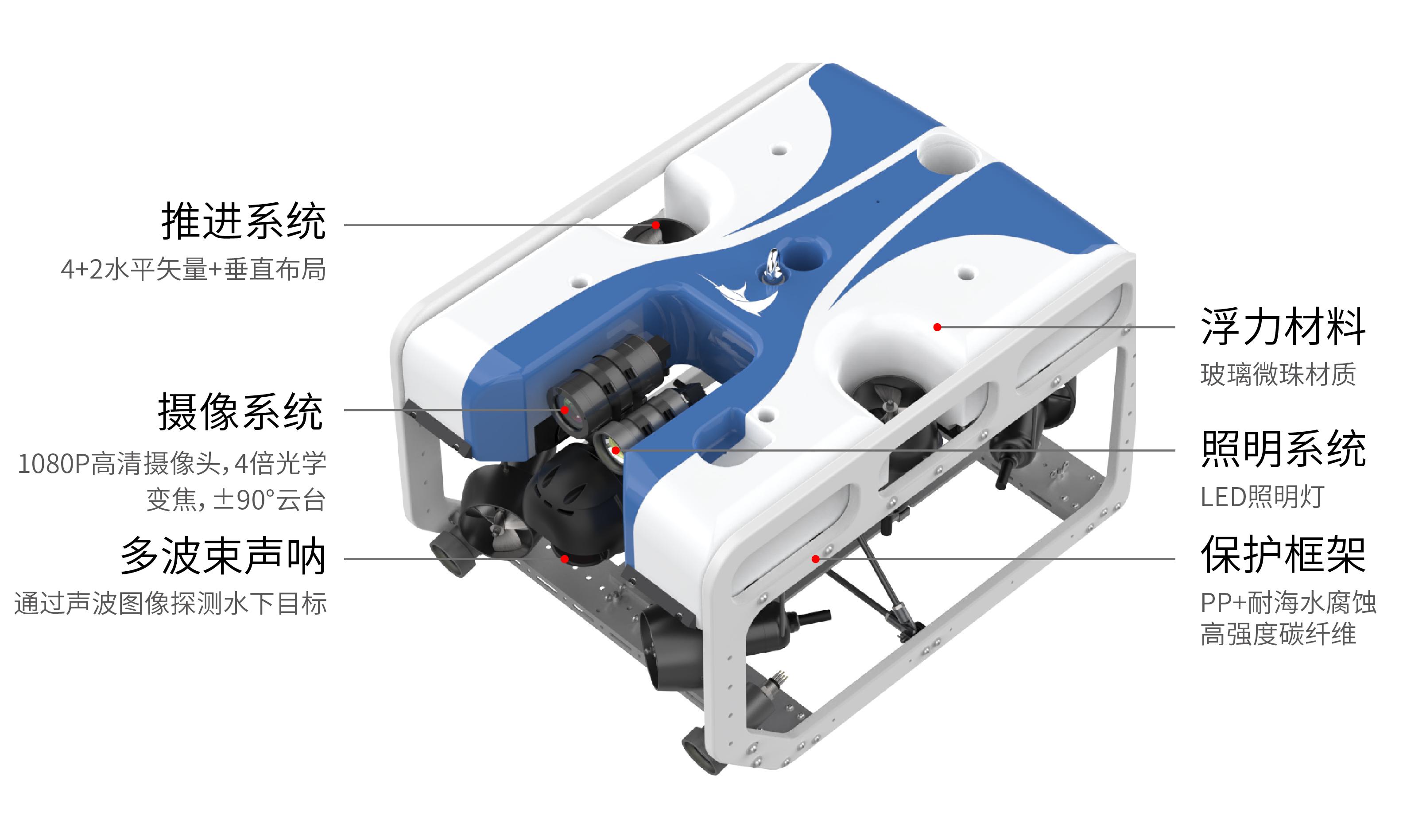 R-45是一款具備較高負載能力的中型觀測級水下機器人,可搭載多樣化工具,具備較強擴展性,搭配大功率推進器使其體量增加的同時保證水下的運動速度保持較高水準,滿足水下作業對觀測級水下機器人的負載能力和航行速度提出的雙重需求。